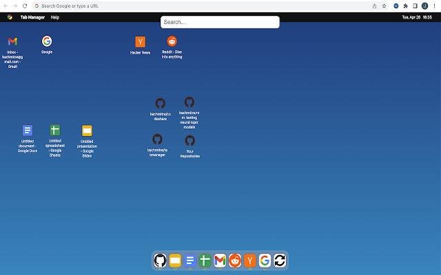 Here comes Tab Manager, a chrome extension to help you organize and easily find your open tabs by displaying them as a desktop. Organize your open tabs like you organize apps on a desktop. Drag them to any place on the screen to group related tabs, and have the most recently used tabs ordered in the dock. Each tab is represented by its favicon, which can be dragged to any position on the desktop. The 10 most recently used tabs are displayed in order of their last use in the dock on the bottom.