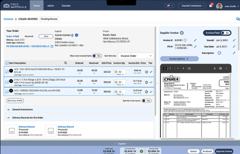 Field Materials is the leading AI procurement platform for contractors to automate PO and invoice processing. Its web and mobile apps streamline material procurement across the entire lifecycle of a construction project, from requesting quotes during pre-construction to managing orders and deliveries to the construction site. It digitizes workflows that were traditionally done in Excel, email, and paper. It eliminates errors and delays in projects through AI-powered checking of delivery slips and invoices, as well as automation of notifications and reminders. Field Materials is transformative in that it provides a centralized system of record to track what the contractor and supplier agree upon and automates follow-up to ensure timely closure. The company partners with both general contractors and specialty subs that buy large quantities of construction materials from trade-specialized suppliers.