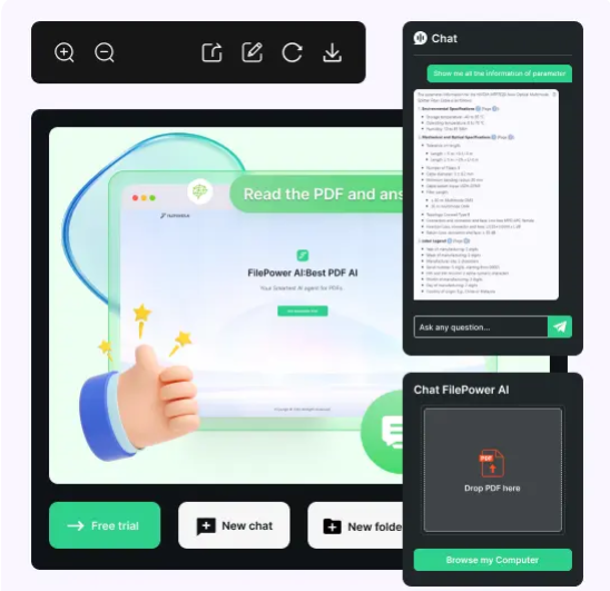 Ask questions and get answers directly from your PDFs. Quickly summarize your files for easy understanding. Translate documents to all voices with one click. Keep your documents organized like a library. Try FilePower AI today and see how simple managing your files can be. The most advanced LLM for smarter responses. Longer memory for better context understanding. Supports all file formats for your convenience. A free trial is available so you can experience it risk-free. Chat with FilePower AI and discover why it's better than the rest. FilePower AI supports all major file formats, including PDFs and PPTs, Excel, and Word, making it versatile for any of your document needs. We offer a free trial so you can experience all the features of FilePower AI without pre-payment. Your privacy and security are our top priorities. FilePower AI uses advanced encryption to protect your files and data.