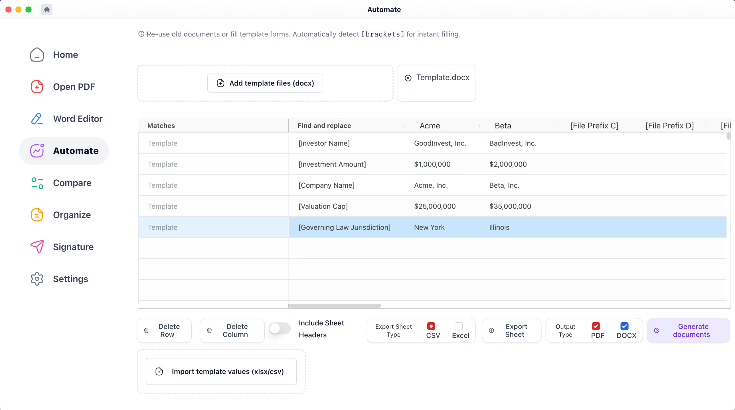 In Macro, you can click on any defined term, section, chapter, clause, and more for instant context. Compare files, consolidate edits from multiple Word and PDF files into one version, generate blacklines in bulk, and compare to templates. Generate files from templates; create one or many documents at a time from a spreadsheet. Combine PDF and Word documents. Free with Macro for Windows and Mac. From an IT and support perspective, Macro is most similar to the desktop versions of Adobe Acrobat and Microsoft Word, with additional enhanced features for financial and legal workflows. This IT documentation proceeds chronologically. Click on any defined term, highlighted in blue, for a popup of the definition as provided within the document, including nested popups that can be used ad nauseum to unravel your document fully.