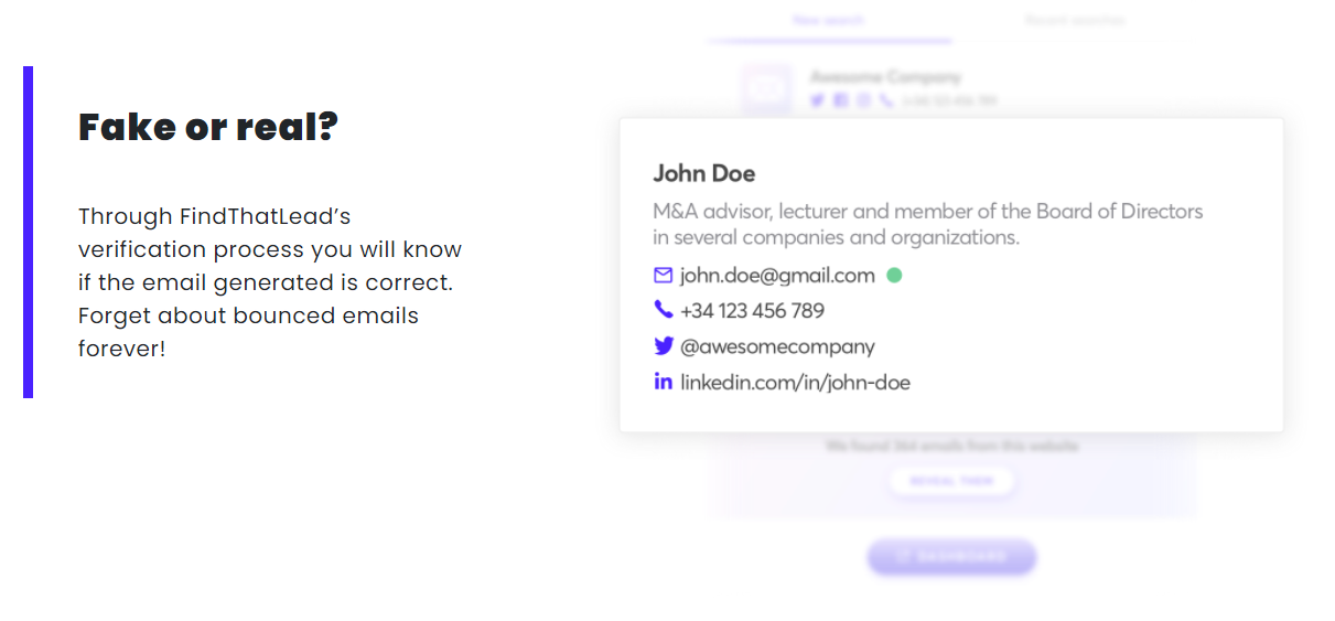 FindThatLead gives you the power to connect with people that matter to you. Send cold emails with FindThatLead for free. It works by connecting to your Chrome browser as a plugin giving you the power to view anyone´s business contact information and social data whilst you are logged into Linkedin. Create your account now and reach thousands of customers every month. Get authentic business emails of new leads at any given company using just their first names, last names and website names. Take the guesswork out of bounced emails and have our advanced algorithm quickly verify an email. Let us help you build a targeted campaign and send it to your leads -- with all the sales funnels and analytics you need to assess performance and grow your business. Turn profiles on LinkedIn, Instagram and more into vetted email leads. Choose from audience segments like location and keywords and reach millions of qualified leads easily.