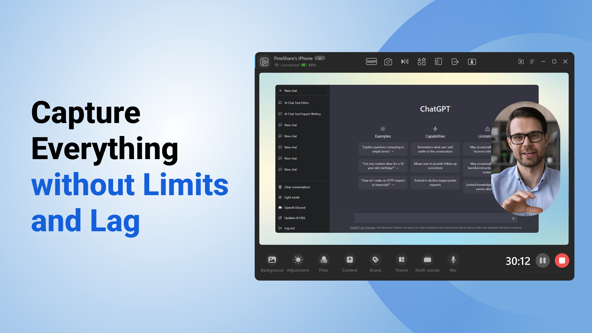 FineCam allows you to use your phone as a high-definition webcam and supports connecting and enhancing other cameras, including digital cameras, DSLR cameras, action cameras, external webcams, or integrated webcams. It lets you share your iPhone screen, application windows, YouTube videos, webpages, PowerPoint slides, videos, and photos in real time and enables you to communicate your ideas to others effectively and make your video look more professional.
