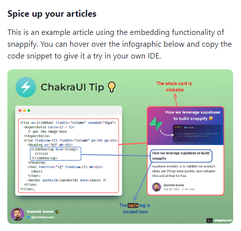 Use snappify to create stunning visuals of your technical concepts, that will engage your followers and take your social media presence to the next level. snappify makes it easy to create educational content that lets your students retain information and grasp complex ideas. snappify enables you to embed your visuals in a way that your viewers can easily copy code snippets or texts. It’s the perfect way to bring your blog to life or spice up your internal company documentation using rich infographics. Sometimes you want to describe differences in code snippets and point out best practices by comparing them. Upload custom images and arrange them per drag and drop. Push your creativity to new boundaries! For example you can add an image of the programming language you're using or place a screenshot of the desired outcome of your code snippet.
