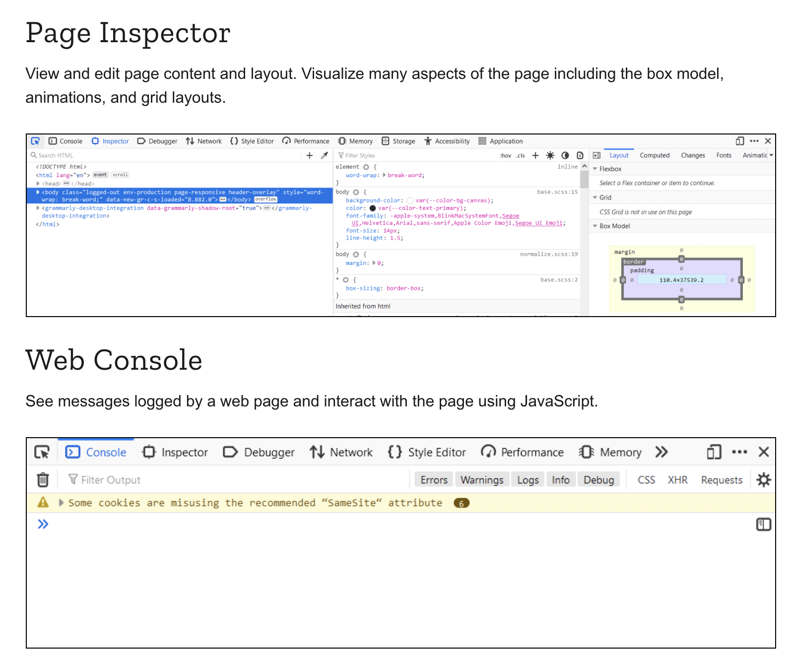 Firefox Developer Tools is a set of web developer tools built into Firefox. You can use them to examine, edit, and debug HTML, CSS, and JavaScript. This section contains detailed guides to all of the tools as well as information on how to debug Firefox for Android, how to extend DevTools, and how to debug the browser as a whole. You can open the Firefox Developer Tools from the menu by selecting Tools > Web Developer > Web Developer Tools or use the keyboard shortcut Ctrl + Shift + I or F12 on Windows and Linux, or Cmd + Opt + I on macOS.