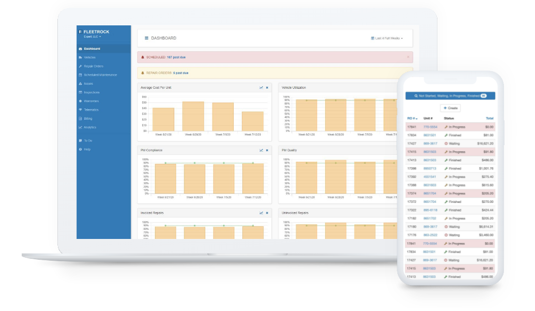 Fleetrock helps fleets run more efficiently, simplifies compliance, and improves customer service. Real-time vehicle & maintenance tracking and performance data provides deep insight into your fleet's operations. Organize and manage vehicle data, assign users and permissions, track lifecycle, and increase uptime. Manage and track repair data, schedule maintenance, report issues, track warranties, and reduce costs. Use vehicle and repair data to unlock powerful insight into fleet and maintenance data trends. Gives you a strategic advantage to leverage the right service provider, for the right repair, at the best price. Our team of ASE repair specialists and coordinators manage the repair process from start to finish. Dashboards, KPI’s, and notifications alert you to critical events and unlock deep insight.