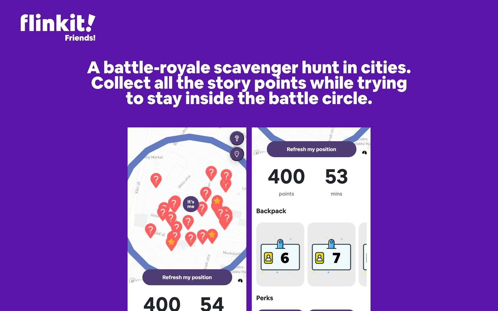 Flinkit provides remote teams with fun and creative cooperation opportunities to enhance teamwork and trust. Teams can compete at the same time as they follow the carefully designed storyline solving highly visual tasks and riddles. Flinkit runs in mobile browsers. No need to download mobile apps. Flinkit is the only one on the market with an intelligent, AI-based map generation algorithm that is capable to generate maps based on the user's location. Use in-game perks like dropping bombs, freezing other players and so much more.