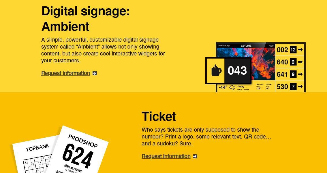 A kiosk designed by Leyline for queue management purposes, simple, beautiful, easy to manage, accessible to people with special needs, customizable to your brand and many-many more. A simple, powerful, customizable digital signage system called “Ambient” allows not only showing content, but also create cool interactive widgets for your customers. Who says tickets are only supposed to show the number? Print a logo, some relevant text, QR code… and a sudoku? Sure. Let your customers book an appointment in advance with our booking module or create your own using the Leyline API. For exhibitions and other events, we provide portable solutions: mobile printers, or registration without a printer at all, mobile apps, etc. Ergonomic interface, colors that are easy on the eye, rich functionality, but also customization from admin panel so you can pick and choose the functions for your staff.