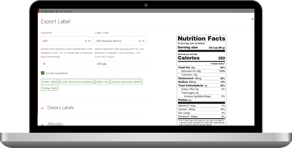 MenuSano is a nutritional analysis and recipe costing software for the restaurant, hospitality, and food service industry. Enter your ingredients and recipes and view a nutritional breakdown. Food manufacturers also benefit from MenuSano by downloading and printing nutrition fact labels.