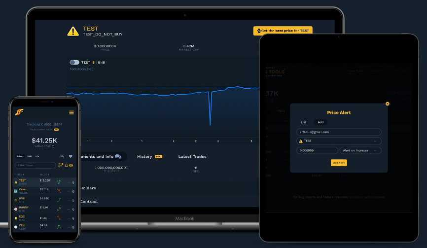 Fool's Tools is DeFi made simple for BSC. A mobile-friendly wallet with all your tokens, price alerts, integrated Quick Swap and more. Powered by Test Token. Now with True Multichain wallet, see all your tokens from different blockchains at the same time, even if they're from different blockchains. We're building tools to make DeFi easier for everyone. Price alert, exchange aggregator, profit/loss analysis, charts, comments, and many other features all in a simple and unified mobile-friendly tool. One easy tool to track all your gains and never forget your investments. Including generated LPs. We all love Apeing into new projects, but it's hard to remember everything, and way too easy to forget where you put your money. Many still use excel files, but we wanted a tool that makes it more practical.