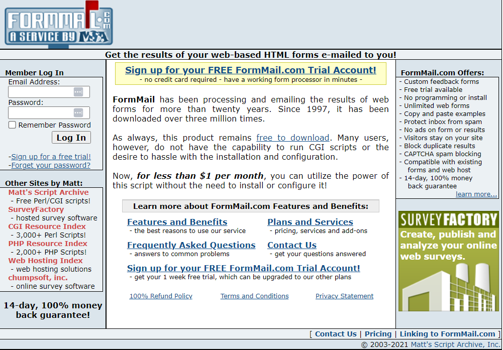 FormMail has been processing and emailing the results of web forms for more than twenty years. Since 1997, it has been downloaded over three million times. As always, this product remains free to download. Many users, however, do not have the capability to run CGI scripts or the desire to hassle with the installation and configuration. In order to send the results of a form to a specific recipient, you must have their email address recorded and approved in your plan. This ensures a double-layer of protection so that you must first authorize any new recipient under your plan and they in turn must allow for these messages to be sent. You can also send a single response to as many of these addresses as you wish.