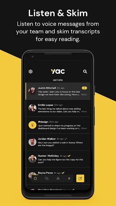 Yac is a voice collaboration platform for remote teams. Record your voice or screen and collaborate fully asynchronously. Eliminate meetings with voice messages. Cut down on meetings & calls with voice messages, searchable transcriptions & async screen sharing. Distributed creative teams in technology industry looking for a voice collaboration platform. With read receipts you'll know when someone has listened to your message, heard your standup, or watched your screenshare. Send it when you're available and your teammates can listen whenever they want. Your single identity on Yac connects you with your co-founder, investor, online friends, and can be used across multiple organizations and teams. Yac works alongside the tools your team uses today. Instead of scheduling a Zoom or typing endless Slack messages back and forth, condense that conversation into a few voice messages or async screenshares. Your team will thank you.