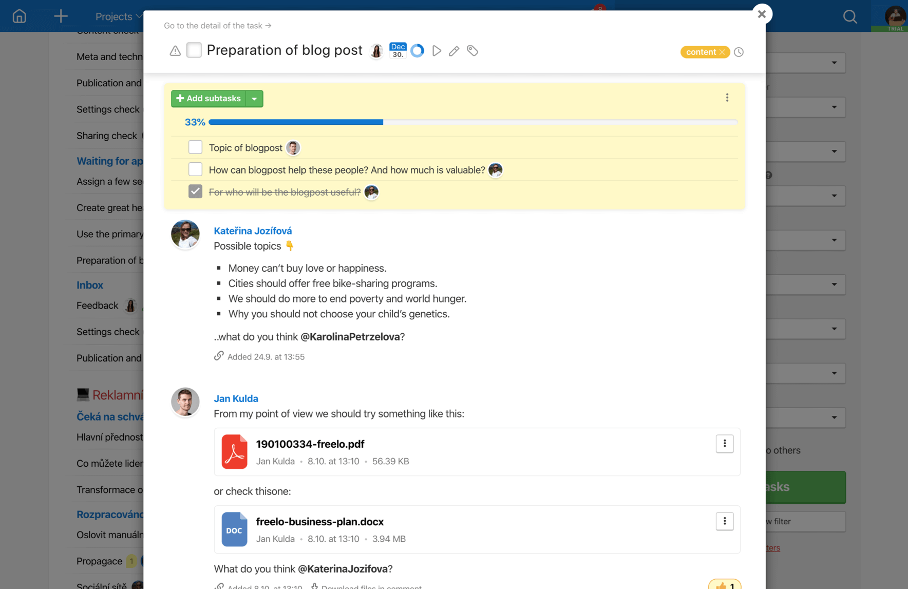Freelo is an online application to organize workflow and communicate with team members or clients. Thanks to Freelo everyone knows what to do, when is the deadline and where to look up the information. There is plenty of project management softwares already, that's for sure. What is special about Freelo? It can take care of the financial side of the projects, you can report time and money spent on every task via user-friendly time tracking. That is related to the pre-set budget of the project so you can quickly control whether you overdraw it. Add-ons such as labels, synchronized calendar, project templates Mind Map, mobile app or reliable customer support are a matter of course.