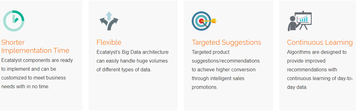 Ecatalyst is a proprietary product which can be integrated with ecommerce software’s like Hybris, Magento etc., and uses events generated by the sites to provide predictions such as personalized predictions, Similar Product predictions, Complementary predictions, Contextual predictions to the users. A proprietary decision making engine that provides predictions and suggestions about the products based on the event traffic of the products in a website. Uses advanced statistical and machine learning techniques for predictions and suggestions. It’s built on top of Big Data architecture and uses HBase and Apache Spark. Highly customizable and provides Intelligent and personalized recommendations to the customers. Captures all the events in real time and provides contextual recommendations to the user. Built on top of Big Data architecture providing great scalability without compromising performance.
