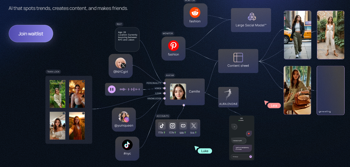 GEN is an AI engine that spots trends, creates content, and makes friends, providing an architecture for AI influence and an engine for cultural resonance. It delivers a seamless system that makes storytelling effortless, unlocking your true influence. Users can forge digital beings by designing unique looks, evolving personalities, and deep narratives for AI characters, then register their unique IP. With smart workflows, GEN scales content generation and scheduling to produce weeks of scroll‑stopping posts in minutes. Its Vibe‑Check feature creates live replicants of target audiences at scale for rapid user and market research, while its niche‑tracking tools instantly identify and align with top‑performing formats and sounds via a large social model. The integrated AURA Engine empowers AI agents to handle replies, DMs, and comments at scale, building genuine connections and driving engagement.