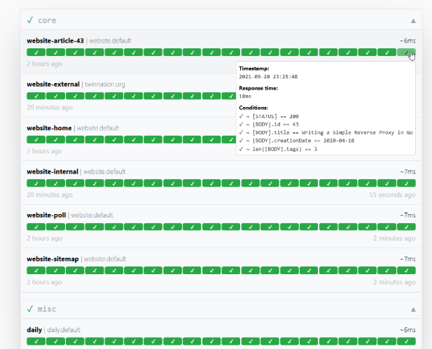 Gatus is an advanced automated status page that lets you monitor your applications and configure alerts to notify you if there's an issue. Designed to monitor REST APIs, it's a perfect fit for overseeing your services. You can monitor for a specific status code or for a keyword in the response body. By prefixing the URL of an endpoint, you can monitor a given target using ICMP. Forget about worthless status pages that only show you the uptime over the past 90 days and fail to accurately dispel users' confused when even after checking the status page, they still don't know what's going on. Gatus is all about what's going on right now. Gatus offers details that no other status pages can match. Our status page is not just a toy for preventing your customers from spamming you, it's a powerful tool to help you run automated user acceptance tests and make sure that you know about a problem before your users do.