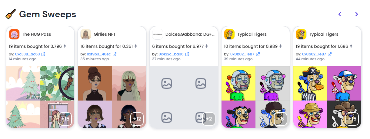 Gem (Gem.xyz) is an NFT marketplace aggregator that enables NFT traders, buyers, and sellers to view NFTs for sale across multiple NFT marketplaces in order to find the best deals and pricing. Add multiple NFTs to your cart & check out. Stop relying on multiple tools to get the data you need. It’s all inside of Gem. Save up to 40% on gas fees, compared to using NFT marketplaces directly. We let you pay with any ERC20 tokens. Connect your wallet to start listing your NFTs. Select the NFTs you want to sell (there’s no limit). Choose the marketplaces where you want to sell and set a selling price. Monitor your active listings and quickly lower prices or delete listings. The best NFT aggregator for collectors, sweepers, and flippers. View real-time sweeps happening across marketplaces via Gem. Get an overview of the transaction details and of all NFTs that were purchased. Protect yourself from losing money due to failed transactions.