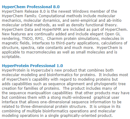 HyperProtein is Hypercube, Inc.'s new product focusing on the computational science associated with protein sequences. The product includes the analysis of one-dimensional protein sequences as well as the analysis of consequent three-dimensional protein structures. In particular, the relationship between sequence and structure is a fundamental facet of the product. Unlike individual software programs that provide capability for some aspect of protein sequence or structure, such as sequence alignment, HyperProtein puts together a multitude of Bioinformatics and Molecular Modeling tools related to the science that initiates with a protein sequence.