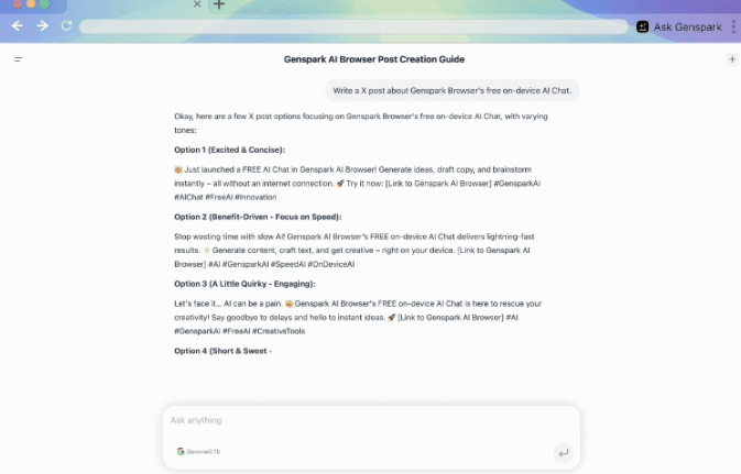 Genspark AI Browser is a desktop browser with built-in AI features that run on the user’s device; no internet is needed for core model responses. It includes agent tools that assist during web browsing, comparing products, analyzing reviews, finding better deals, and helping with informed decision-making on any site. There is an autopilot mode that can automatically browse feeds, gather information, access premium databases, and perform complex web tasks without user intervention. The browser includes ad-blocking so that banners, pop-ups, and intrusive ads are blocked automatically to provide a cleaner, faster browsing experience. There’s also an MCP store, which lets users connect their browser to over 700 tools to enable workflow automation. The emphasis is on privacy (on-device AI), speed, and reducing friction in browsing, shopping, research, or general web tasks.
