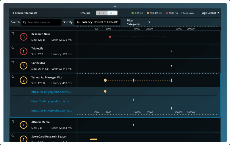 Validate tracking scripts, ensure pages are optimized before launching your campaign and improve ROI. Test, troubleshoot and optimize how tags and scripts are implemented on a website. Gather intelligence and analytics about the tags and trackers on your website or others. Identify privacy risks that may impact user security, page performance and violate compliance law. Real-time visualization of each tracker’s behavior as page loads. The tracker list provides a deep dive into what trackers and scripts are operating on a website. Privacy-related statistics and usage trends for specific trackers and websites.