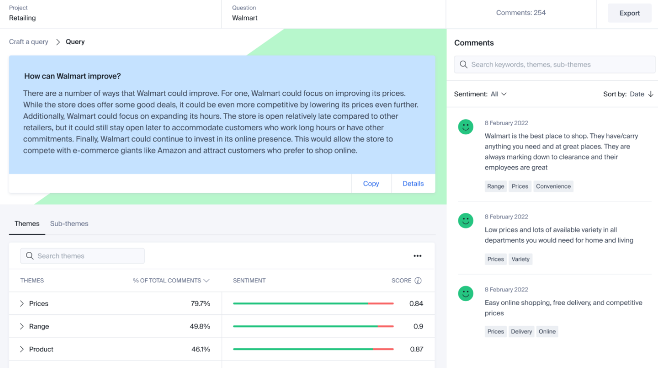 Our revolutionary AI-powered insights generator, Hey Yabble uses a unique combination of Yabble proprietary algorithms and OpenAI’s GPT-3 neural network to generate rich, detailed insights from your unstructured text data. It’s remarkably fast and powerful, and the insights it produces have the potential to transform your business. Choose from Hey Yabble’s two key functionalities — Count and Query — or use them together to get the best, most targeted results. Hey Yabble’s AI technology is unique to our business. It uses a remarkably fast and accurate combination of our proprietary algorithms and OpenAI's state-of-the-art GPT-3 neural network. Hey Yabble takes huge amounts of manual work off your plate — to date, it's saved customers more than 1,500,000 minutes of time — enabling you to focus on what really matters: driving strong business outcomes from your insights.