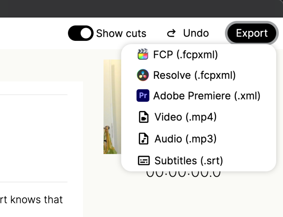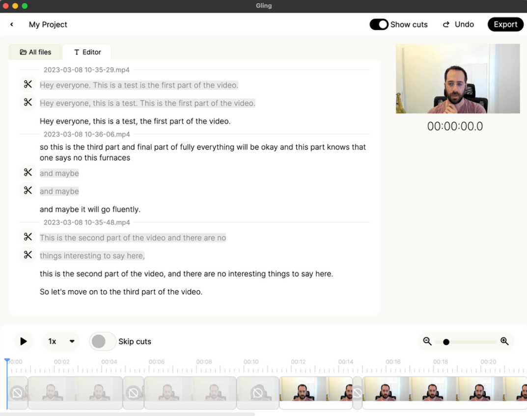Select one or more video files, and we will send it for AI transcription and will remove your bad takes for you. Review your edited video. You can further edit the video by removing parts of the text or removing clips from the timeline. You can export an XML from Gling and import it as a timeline directly to Premiere, Final Cut Pro or DaVinci Resolve. Using a different video editor? No worries. You can always export from Gling as mp4 and import to any editor.