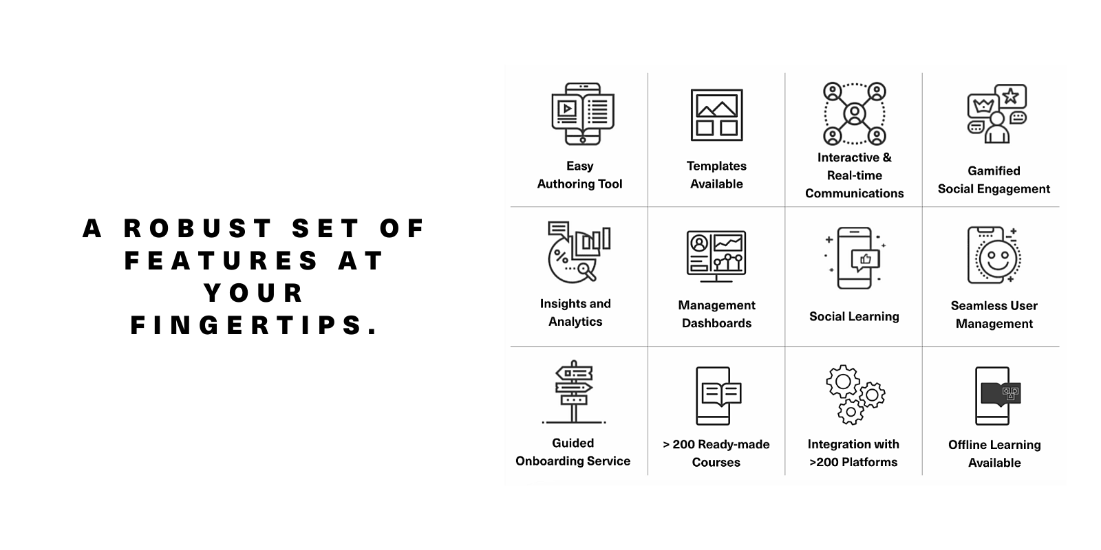 The app/platform features community boards for shared learning and engagement, scheduled session deployment, rapid curation accessing multimedia options, gamification, offline access and push notifications.