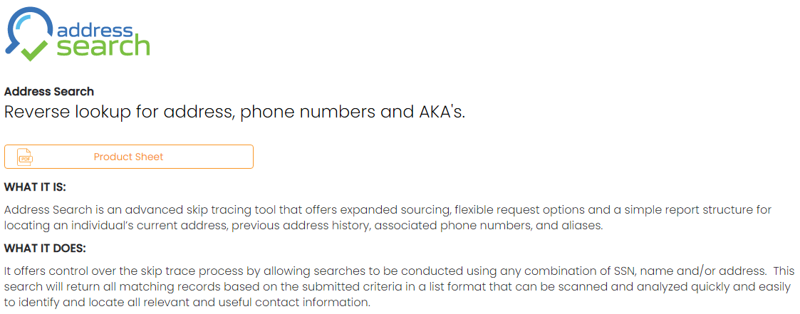Address Search is an advanced skip tracing tool that offers expanded sourcing, flexible request options and a simple report structure for locating an individual’s current address, previous address history, associated phone numbers, and aliases. It offers control over the skip trace process by allowing searches to be conducted using any combination of SSN, name and/or address. This search will return all matching records based on the submitted criteria in a list format that can be scanned and analyzed quickly and easily to identify and locate all relevant and useful contact information. In addition to the request and deliver advantages, MicroBilt Address Search’s sourcing strategy offers users seamless access to expanded header and compiled data. Assists collections and recovery users with locating addresses and phones on hard-to-find skips. Data returned includes SSN, date of birth, name and aliases, etc.