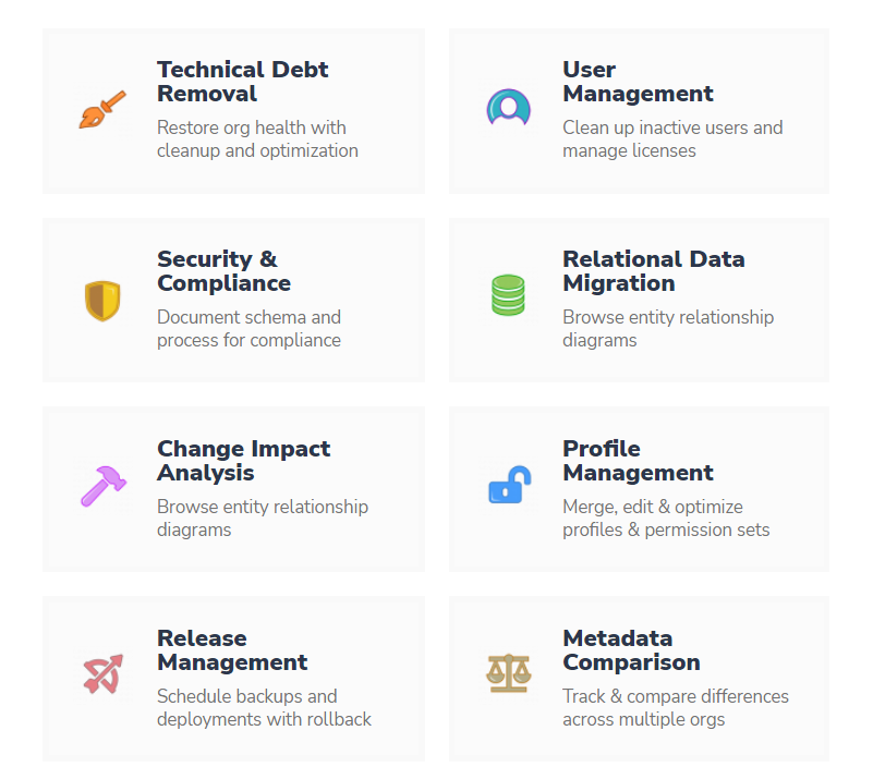 Change & Release Management Tool for Salesforce Admins. Snapshot provides highly visual tools to deploy metadata assets from a sandbox or Salesforce DX project to a production account. Over 40 comprehensive reports document every aspect of your Salesforce account: unused assets, complex relationships, disaster recovery, data security, and corporate compliance. With Snapshot you can forget about code. This powerful platform helps Salesforce professionals conquer complex Orgs with easy-to-use, drag and drop tools. It has never been easier to visualize and reduce complexity, improve security and compliance, and lower the total cost of org ownership. Metazoa Snapshot is the industry’s most comprehensive toolset for Org Management, Technical Debt Removal, and so much more!