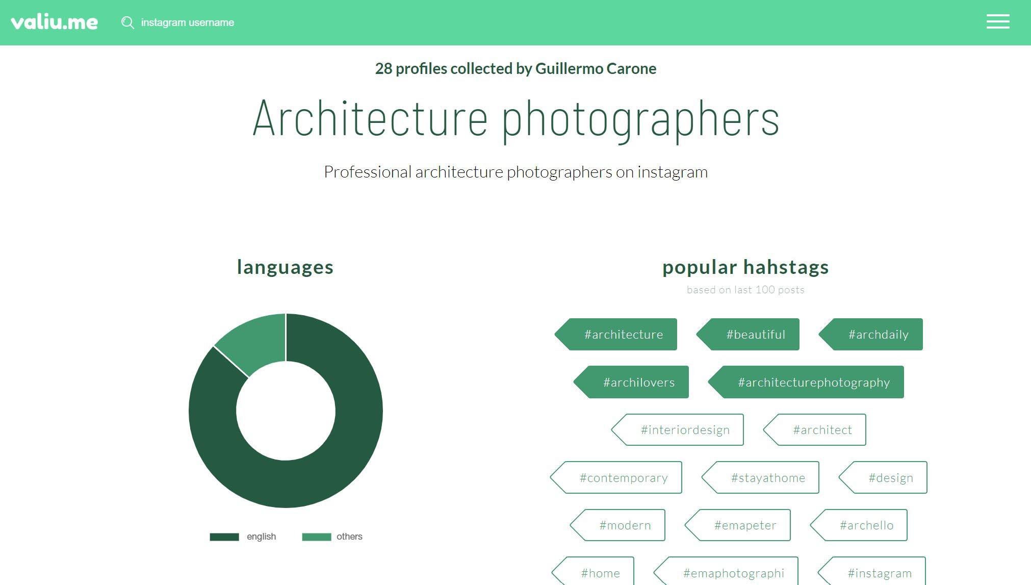 valiu.me takes raw instagram data and transform it into smart, valuable and comprehensive reports to help you make the most out of influence marketing. Access complete statistics, history and data to have the best overview of an Instagram account. Our powerful algorithms and machine learning capabilities will extract all the relevant information and present them in clever analytical reports. Create thematic collections of influencers accounts and share your collections with the world or with a private circle. See your collections with a ranking, photo display or analytical view, and get valuable data. Create influencer marketing campaigns and track their progress directly on valiu.me Add notes and keep track of each individual collaboration as well as the overall campaign progress.