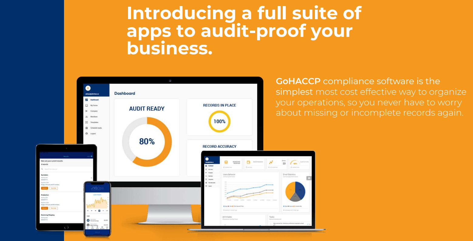 GoHACCP compliance software is the simplest most cost effective way to organize your operations, so you never have to worry about missing or incomplete records again. A system that constantly monitors with smart alerts, and analyzes real threats before they become and issue. A self-auditing platform that continually directs relevant data to the right places. A gamified video based training platform that encourages learning and staff engagement. Working around the clock to guarantee safety and compliance. Customized systems, patented software and technology. Experience real-time metrics on all audit related records with our dashboard system. Improve your compliance score to pass any audit. Boost efficiency with your compliance data gathering and organisation.