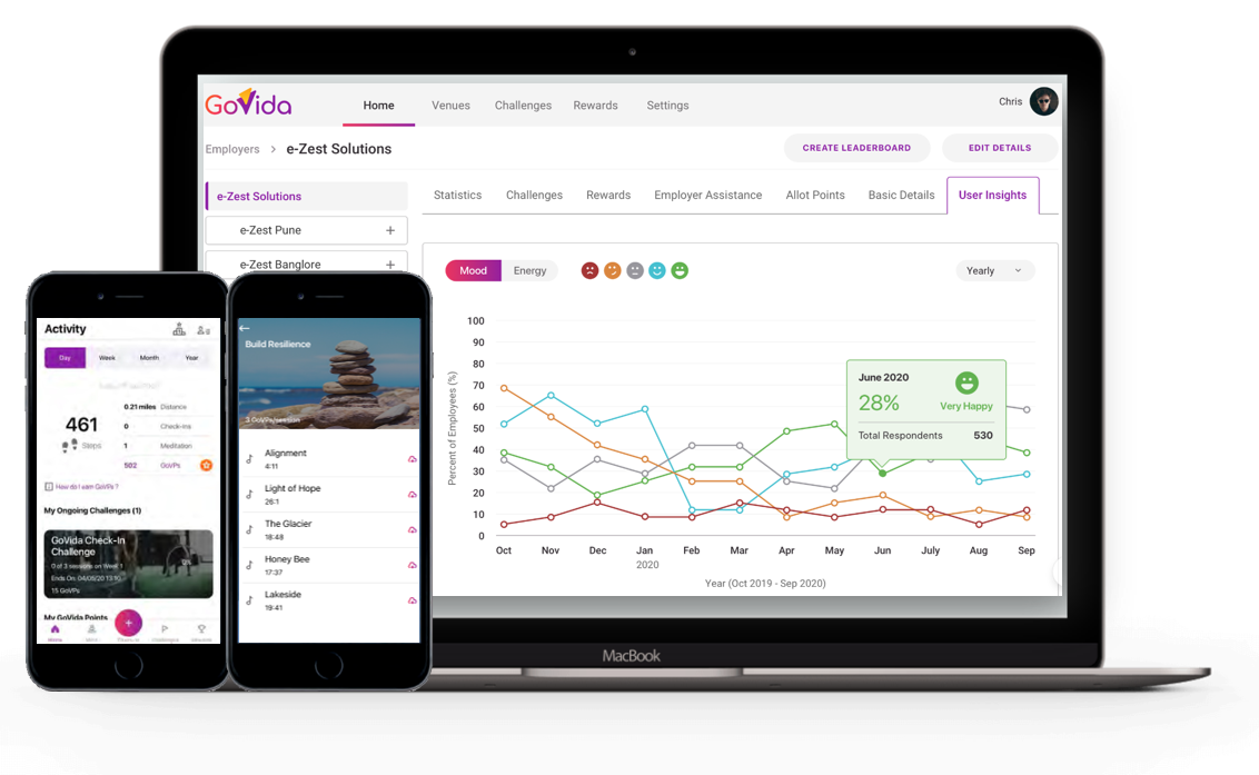 GoVida is the “go to” platform for employee wellness and health improvement. Our smart phone app and admin portal provide the tools businesses need to proactively improve the physical and mental wellbeing of their teams.