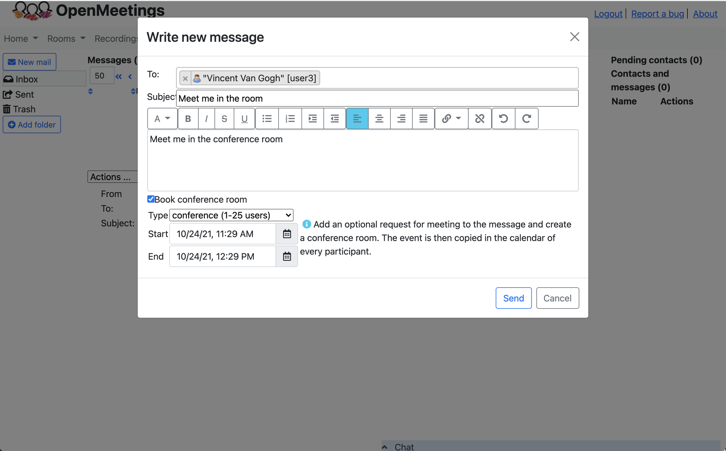 Openmeetings provides video conferencing, instant messaging, white board, collaborative document editing and other groupware tools. It uses API functions of Media Server for Remoting and Streaming Kurento. OpenMeetings is a project of The Apache Software Foundation, the old project website at GoogleCode will receive no updates anymore. The website at Apache is the only place that receives updates.