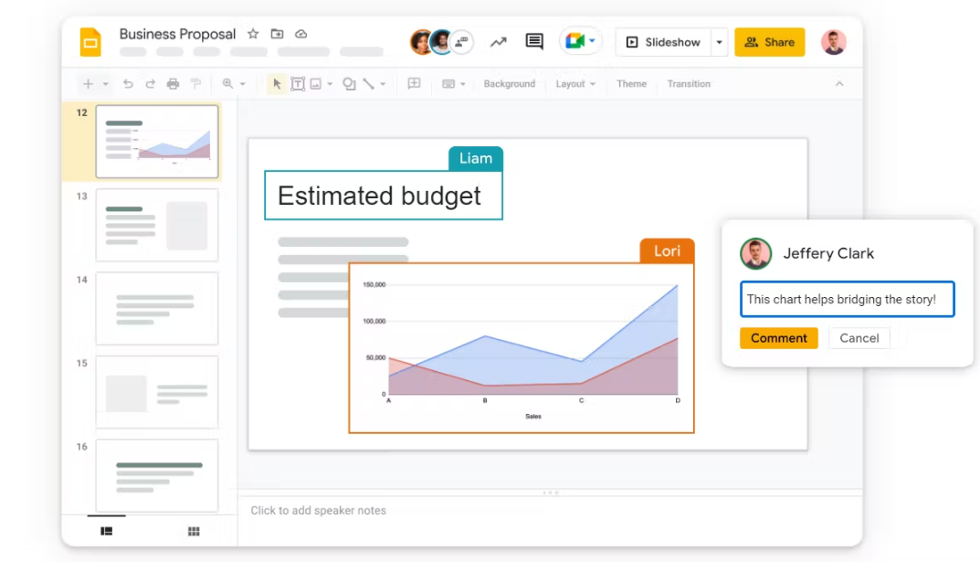 With Google Slides, you can create, edit, collaborate, and present wherever you are. Create and edit polished presentations in your browser—no software required. Multiple people can work at the same time so everyone always has the latest version. Commenting, chat and real-time editing. Work on a single presentation online with your business partner, your whole team or external contacts. You control who gets permission to edit, view or just add comments. Start from scratch or expedite the process by choosing a template. You can enhance your presentations with videos, images, drawings and smooth transitions. View or even present your slides from your phone or tablet, so you always have the option to practice your presentation up until the last minute. Presentations get saved automatically online and versions are kept indefinitely without counting toward your Drive storage, so you can always track and undo revisions.