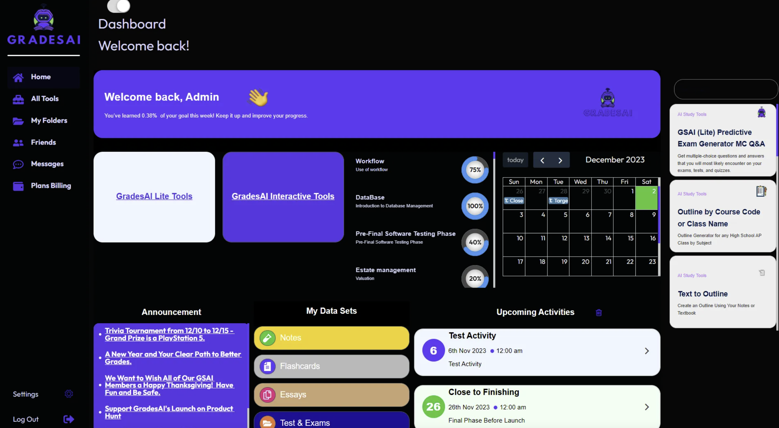 GradesAI uses artificial intelligence to create personalized study plans and predictive practice tests that are based on your syllabus, class outline, historical data, and 100s of other data points. We then feed all the data into our GSAI algorithm to create exam prep tailored to your learning style, goals, and feedback. GradesAI will generate your outline, class notes, predictive practice exams, flashcards, and all the exam prep you need to get the best grade possible. A friendly and supportive community of students and tutors who can help you with any questions or challenges. Free access to all GradesAI tools and, for those who want to accelerate success, flexible subscription plans that fit your budget and needs. Monitor your progress with visual displays of your scores and performance on previous tests. Access your notes, flashcards, tests, essays, and your own uploaded material.
