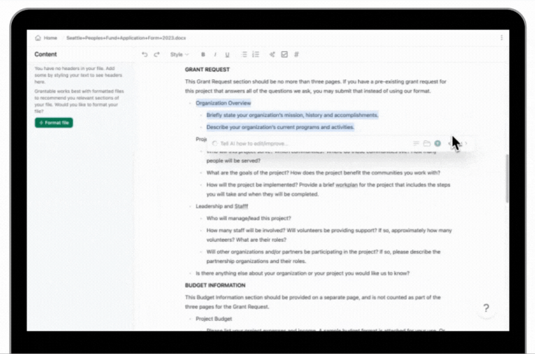 Grantable is the leading AI-assisted grant-writing solution that helps grant-seekers win more funding with less effort. In a clean and familiar writing space, it uses content from your previous proposals to draft responses to new application questions, which you can revise and approve. The platform stores all of your work automatically as a smart content library and continues to improve as you use it. Grantable is a world-class grant-writing assistant for everyone, powered by AI. All of your grant proposal content is sourceable in one place. Search and reference all of your content. Draft responses instantly with AI and craft a narrative using your facts, figures, and style. Revise and resize with simple prompts, no more fussing with character counts. With Grantsimple, you can identify, write, and manage hundreds of grants. Try our free forever plan and upgrade when it suits your needs.