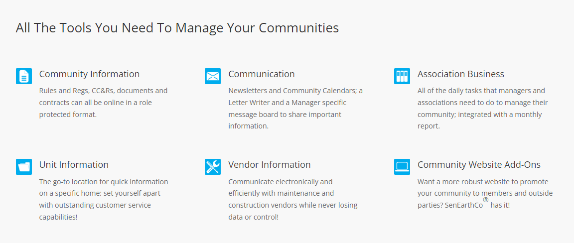 Our system gives managers an efficient methodology for managing associations, communicating with Boards and homeowners and sharing data with internal staff and vendors. Management made easy through an integrated management system that connects seamlessly to your accounting software. All of the daily tasks that managers and associations need to do to manage their community; integrated with a monthly report. The go-to location for quick information on a specific home; set yourself apart with outstanding customer service capabilities! Communicate electronically and efficiently with maintenance and construction vendors while never losing data or control! In addition to assuring greater efficiency and less frustration for you, SenEarthCo® improves relationships with homeowners.
