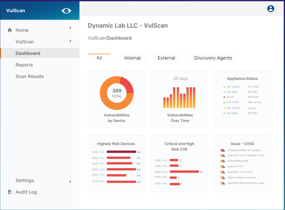 Protect the networks you manage with flexible network scanning options. Vulscan includes on-prem internal network scanners, computer-based discovery agents, remote internal scanning by proxy, and hosted external scanners for comprehensive vulnerability management.