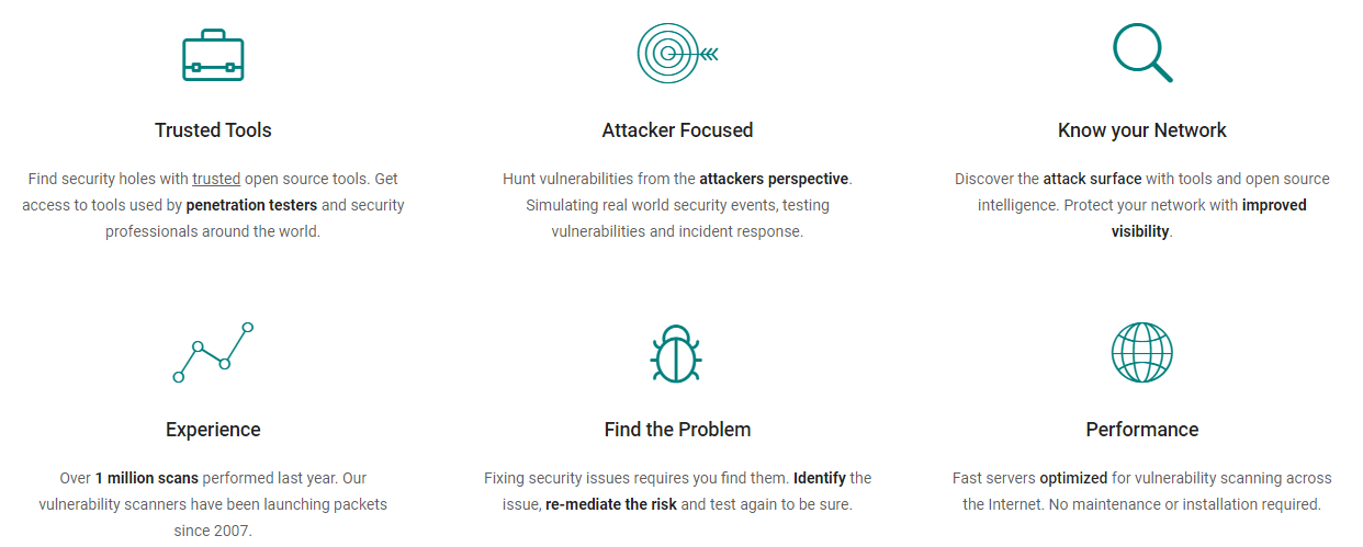 Simplify the security assessment process with hosted vulnerability scanners. From attack surface discovery to vulnerability identification, actionable network intelligence for IT & security operations. Proactively hunt for security weakness. Pivot from attack surface discovery to vulnerability identification. Find security holes with trusted open source tools. Get access to tools used by penetration testers and security professionals around the world. Hunt vulnerabilities from the attackers perspective. Simulating real world security events, testing vulnerabilities and incident response. Discover the attack surface with tools and open source intelligence. Protect your network with improved visibility. Over 1 million scans performed last year. Our vulnerability scanners have been launching packets since 2007. Fixing security issues requires you find them. Identify the issue, re-mediate the risk and test again to be sure.