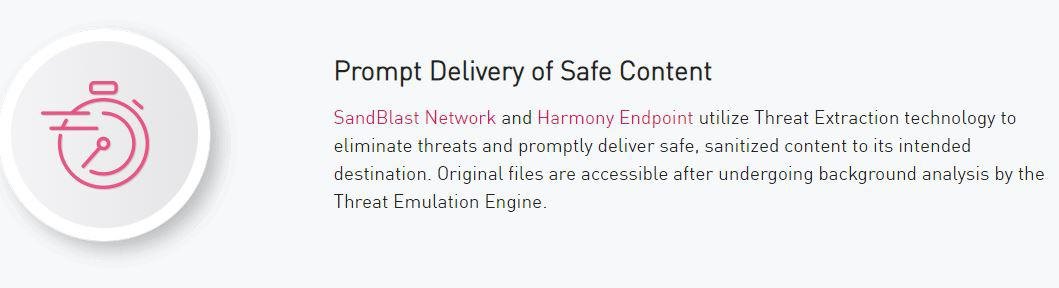 The SandBlast Threat Extraction technology is a capability of SandBlast Network and the Harmony Endpoint protection solutions. It removes exploitable content, reconstructs files to eliminate potential threats, and delivers sanitized content to users in a few seconds to maintain business flow. Reconstruct files with known safe elements in web-downloaded documents and emails. Immediate delivery of sanitized versions of potentially malicious files to maintain business flow. Access to original files after background analysis of attack attempts. SandBlast Network and Harmony Endpoint utilize Threat Extraction technology to eliminate threats and promptly deliver safe, sanitized content to its intended destination. Original files are accessible after undergoing background analysis by the Threat Emulation Engine. SandBlast Threat Extraction supports the most common document types used in organizations today.