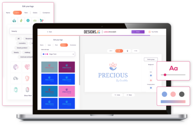 Design a bold, modern logo for your brand in 2 minutes. Designs.ai Logomaker is an A.I. logo generator and brand builder. The only tool you need to create stunning logos. Logomaker is smarter, faster, and easier. Use artificial intelligence and our library of 10,000+ icons to create a powerful logo at a fraction of the required time, cost, and effort. Advanced A.I. technology Logomaker uses A.I. to analyze your brand information and generates thousands of logo in seconds. Quick, easy, and cost-effective. Generate thousands of logos in seconds. Smart suggestions for icons, fonts, colors. Export a full brand identity kit with A.I. Full brand identity package. Generate all your brand collateral instantly. The kit includes social media logos, branded merchandise mockups, and style guidelines. Your logo in PNG, JPEG, SVG, and PDF Brand narration, assets, and guidelines. Device, product, business card mockups. Smart, intuitive logo editor. Easy step-by-step logo creation.