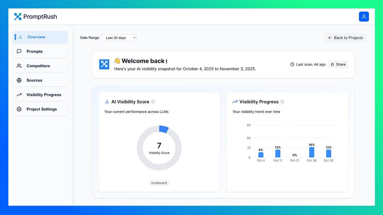 PromptRush is an AI mention monitoring platform that tracks how your brand appears across leading large language models like ChatGPT, Gemini, Claude, and more. It reveals when and where your brand is mentioned, shows the source prompts and URLs, and compares your AI visibility against competitors. With PromptRush, you can understand your brand’s presence in AI-generated content and stay ahead in the new era of AI search.