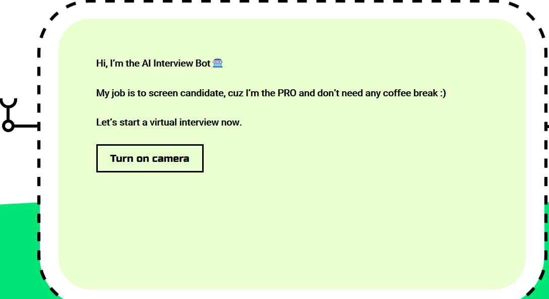 A.I. Interview Bot For Everyone. Providing you with an interview specialist, make hiring cheaper, faster, and easier! Why AI interview bot is better? Unbiased. AI bot can screen candidates based on interview data without any bias and mindset. Save time. AI bot can do interview, screen, and book meeting time, saving you not only time but also money. Traceable. All of the interview data (include videos) will be permanently stored in the cloud, fetch anytime! Instant feedback. AI bot can interview every candidate and give an immediate response on whether they are qualified or not. Brand-new Hiring Journey. Choose an AI interview bot. Selecting bots designed for different positions will screen the right candidate for the corresponding position. View Demonstration. Set perferences. Post your link. Wait for Email. Schedule next meeting. Explore Bots for Occupations. We offer 4 standard bots for specific occupations, they are all experienced and reliable. You can start hiring right away