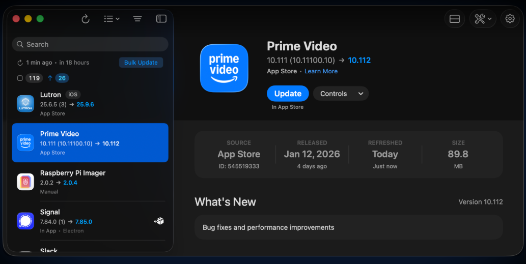 Updatest is a native macOS application designed to be your central hub for managing and installing updates for apps on a Mac by scanning each installed application to find supported update sources such as Homebrew, Mac App Store, Sparkle, Electron, and GitHub Releases, and aggregating available updates without relying on a database. It automatically detects update sources using an app’s internal metadata and presents available updates in a visual interface that lets users discover, select, and install updates in bulk or individually, giving users control over which updates to apply and which to skip. Updatest brings clarity to managing updates by integrating with Homebrew’s adoption feature, allowing users to adopt apps into Homebrew casks so they can benefit from Homebrew’s update ecosystem. It provides deep insights into each app, including version numbers, bundle identifiers, file sizes, direct download URLs where available.