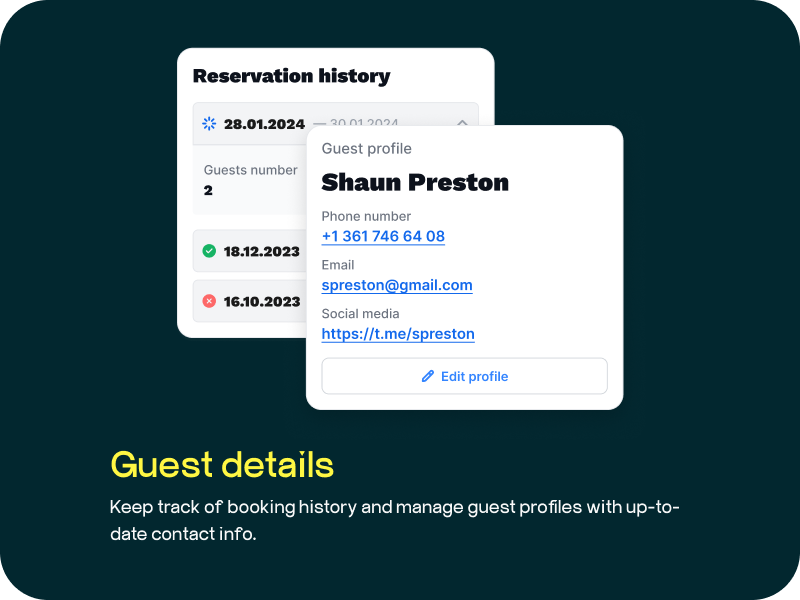 - CRM: Save guest profiles with contact details and social media links for seamless communication and support.