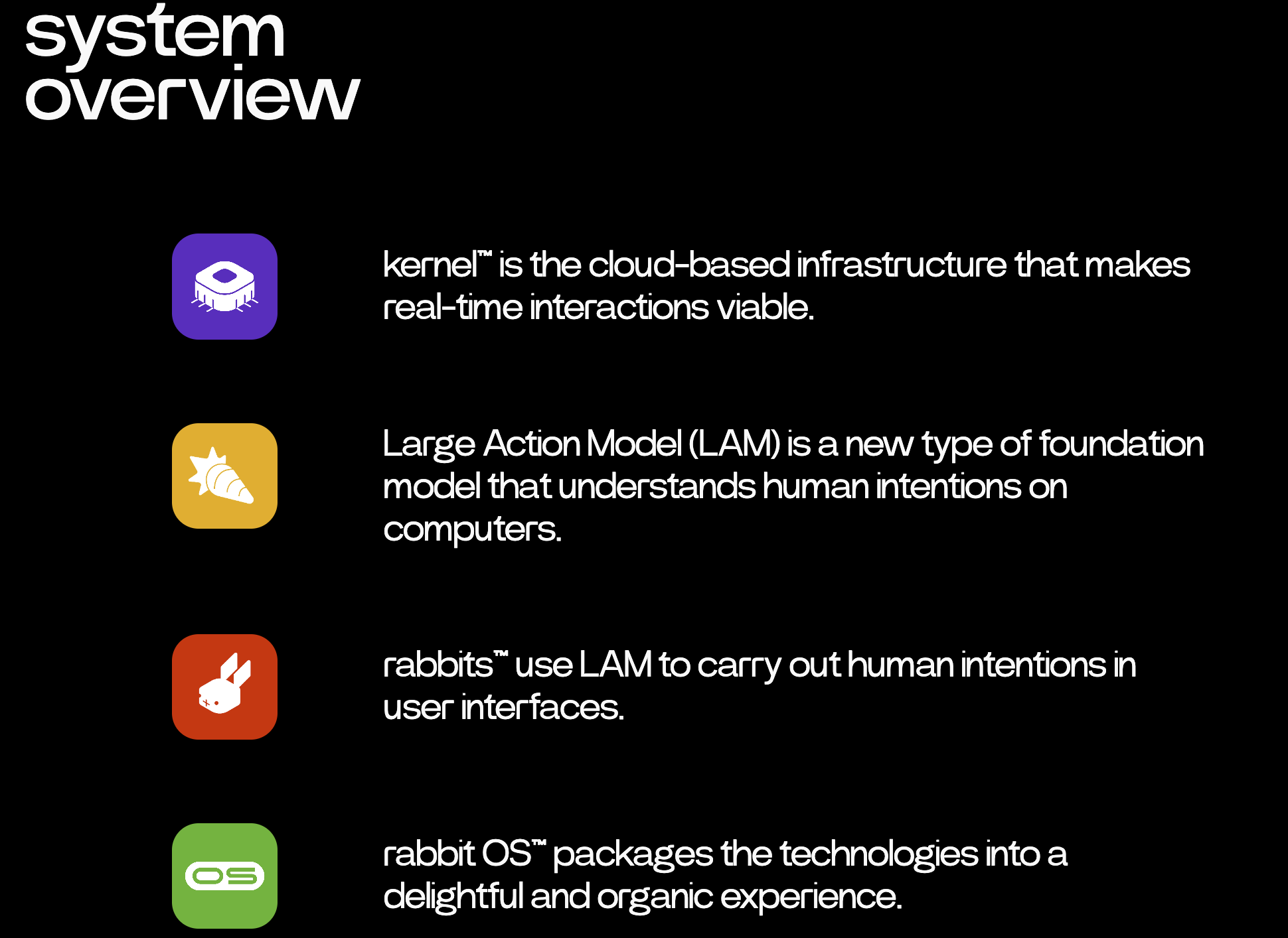 Existing personal computers are limited to understanding commands rather than complex human intentions. LAM first translates natural language requests into actionable steps and responses that the operating system can use in real-time. As opposed to application programming interfaces (APIs) that have limited functionality, LAM understands and operates human-oriented interfaces across all mobile and desktop environments. Not only does LAM understand how to interact with applications to achieve certain objectives, it also knows how to achieve it in a humanizing way.