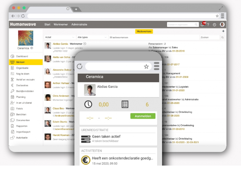 Humanwave is the HR software for the SME manager and his team. With the humanwave app, it is possible to request leave, report illness, enter expense claims, see payslips, view your planning and check your own dossier. Arrange and manage your HR administration in one place. No more loose Excel sheets, notes and notes. Add a new employee, including all documents and the digitally signing contract. Employees do this themselves, so the leave is always current. You can immediately see who are and who are not.
