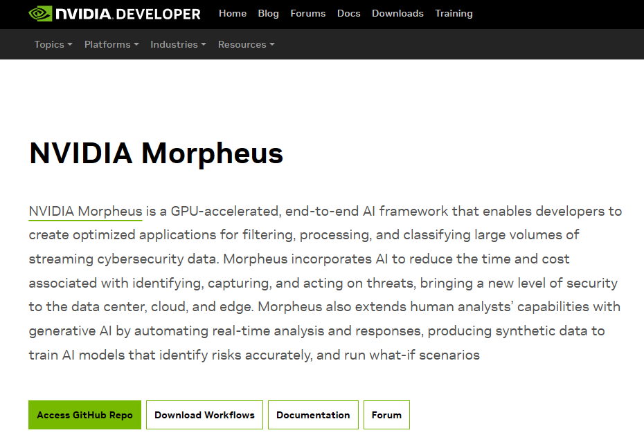 NVIDIA Morpheus is a GPU-accelerated, end-to-end AI framework that enables developers to create optimized applications for filtering, processing, and classifying large volumes of streaming cybersecurity data. Morpheus incorporates AI to reduce the time and cost associated with identifying, capturing, and acting on threats, bringing a new level of security to the data center, cloud, and edge. Morpheus also extends human analysts’ capabilities with generative AI by automating real-time analysis and responses, producing synthetic data to train AI models that identify risks accurately and run what-if scenarios. Morpheus is available as open-source software on GitHub for developers interested in using the latest pre-release features and who want to build from source. Get unlimited usage on all clouds, access to NVIDIA AI experts, and long-term support for production deployments with a purchase of NVIDIA AI Enterprise.