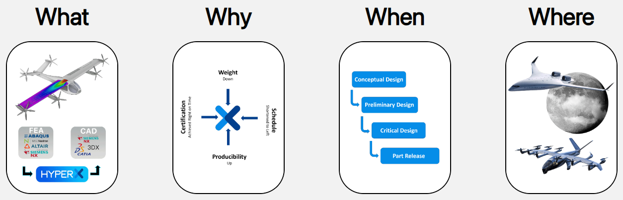 Collier Aerospace develops HyperX, a computer-aided engineering software suite for structural analysis, design optimization, and lightweighting of aerospace and high-performance composite and metallic structures. HyperX provides engineers with an automated framework to perform classical and advanced failure analyses with margin-of-safety reporting across hundreds of analytical methods and thousands of finite element analysis load cases, then sizes structural elements to find the lightest manufacturable combination of materials, panel geometries, layup ply angles, and stacking sequences. It integrates with users’ preferred FEA and CAD tools, updating optimized panel and joint designs directly in both FEM and CAD models and maintaining a consistent digital thread from concept through certification. HyperX’s capabilities include stress analysis, sizing optimization, producibility evaluation, certification-ready reporting, data traceability, and trend dashboards.