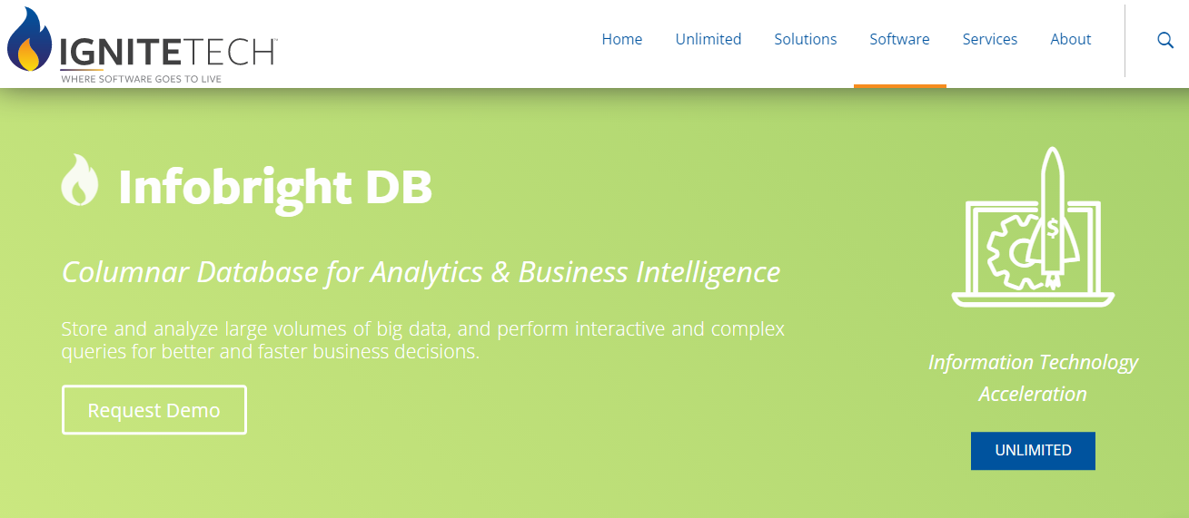 Infobright DB is a high-performance enterprise database leveraging a columnar storage engine to enable business analysts to dissect data efficiently and more quickly obtain reports. InfoBright DB can be deployed on-premise or in the cloud. Store & analyze big data for interactive business intelligence and complex queries. Improve query performance, reduce storage cost and increase overall efficiency in business analytics and reporting. Easily store up to several hundred TB of data — traditionally not achievable with conventional databases. Run big data applications and eliminate indexing and partitioning — with zero administrative overhead. With the volumes of machine data exploding, IgniteTech’s Infobright DB is specifically designed to achieve high performance for large volumes of machine-generated data. Manage a complex ad hoc analytic environments without the database administration required by other products.