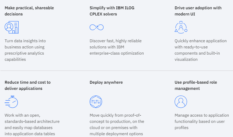 IBM Decision Optimization Center provides a configurable platform to support business decision-makers such as scientists, developers, analysts, planners and schedulers. It uses powerful analytics to solve tough planning and scheduling challenges, reducing the effort, time and risk associated with tailored, business improvement solutions. Deploy the platform to make smarter decisions and improve ROI by combining data and analytics with cutting-edge optimization technology. Turn data insights into business action using prescriptive analytics capabilities. Discover fast, highly reliable solutions with IBM enterprise-class optimization. Quickly enhance the application with ready-to-use components and built-in visualization. Work with an open, standards-based architecture and easily map databases into application data tables. Manage access to application functionality based on user profiles.